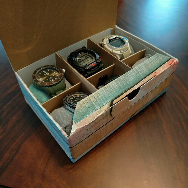 Η συνεχής παραμονή και η αδυναμία εύρεσης στα γούστα μου ενός κουτιού για τα πιο τρόπον τινά οικονομικά ρολόγια, με έβαλε στη διαδικασία κατασκευής ενός.Πάρα πολύ ωραία. Είμαι και εγώ σε φάση αναζήτησης θήκης αλλά καμία δε μου άρεσε, οπότε το πρότζεκτ κατοχυρώθηκε. Από παιδικά καλτσάκια και πάνες άλλο τίποτα.