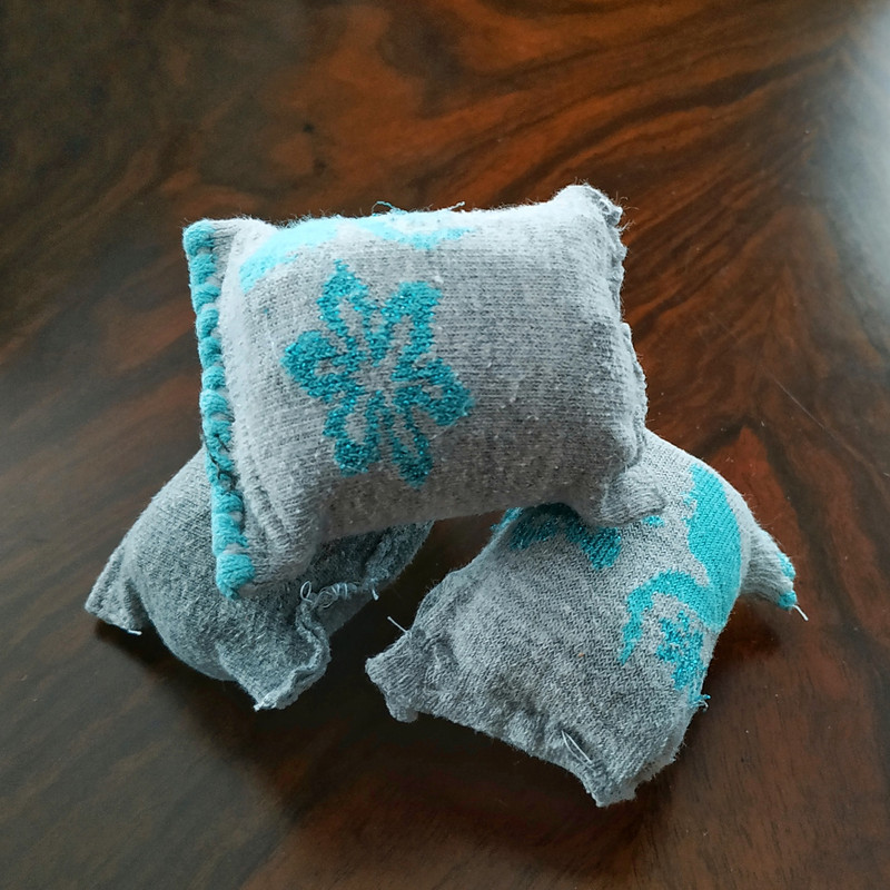 Κόβουμε καλτσάκια παιδικά, βοηθάει το μέγεθός τους και γεμίζουμε. Με τι; Χμμμ εγώ χρησιμοποίησα πάνες. Είτε παιδικές είτε ενηλίκων. Ρολάκι και μέσα στο καλτσάκι!