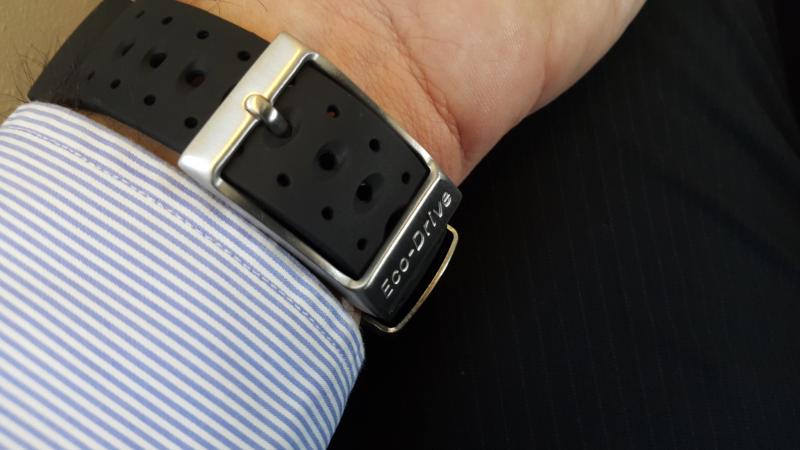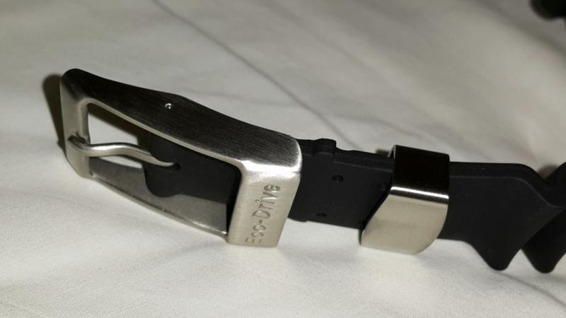 Το λουράκι του ρολογιού είναι εξαιρετικά ποιοτικό και κατασκευασμένο από λάστιχο που ντύνεται όμορφα με μεταλλικά στοιχεία το κούμπωμα και τη θηλιά. Στο κούμπωμα υπογράφεται η ύπαρξη του Eco-Drive μηχανισμού.