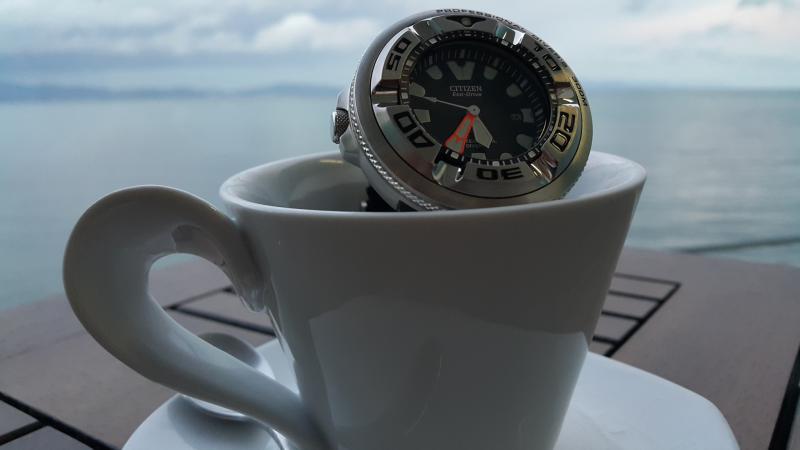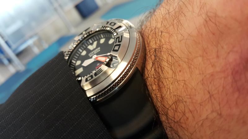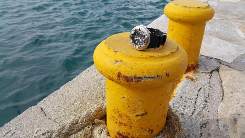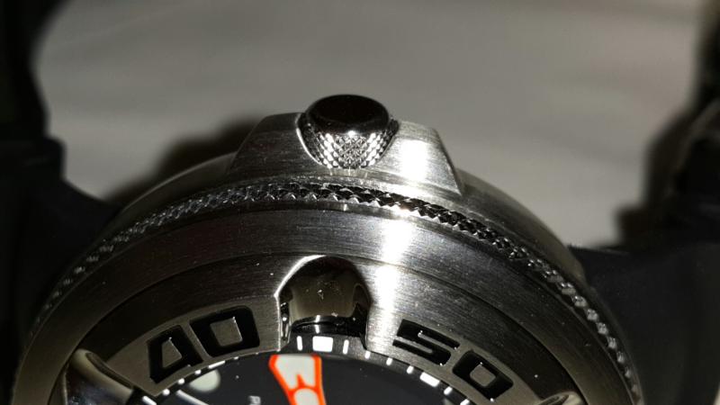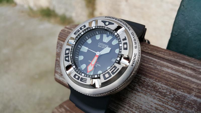 Βρίσκω ενδιαφέρουσα τη φωσφορίζουσα κουκίδα που βρίσκεται στη θέση μηδέν (0) του δίσκου χρονογράφου της κάσας του ρολογιού, που αφήνει τον υπαινιγμό για τη χρήση του ρολογιού σε βάθη μέχρι και 300 μέτρα.