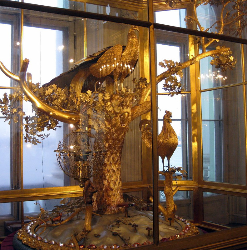 Το κομψό ρολόι Παγώνι χρονολογείται από το 1777, όταν κατασκευάστηκε από τον γνωστό επιχειρηματία James Cox. Έφτασε στη Ρωσία το 1797 και για ένα μικρό χρονικό διάστημα ανήκε στον πρίγκιπα Γκριγκόρι Ποτέμκιν, γνωστός ως ο μυστικός σύζυγος της Μεγάλης Αικατερίνης στη οποία και το δώρισε τελικά. Από τον 18ο αιώνα μέχρι σήμερα ο επισκέπτης του Ερμιτάζ μπορεί να θαυμάζει το θέαμα τριών πτηνών - του παγωνιού, της κουκουβάγιας και του κόκορα τα οποία περιτριγυρίζονται από διάφορα μικρά γλυπτά έντομα και ζωάκια. Πρόκειται για το μοναδικό μεγάλο παράδειγμα ρομποτικής του 18ου αιώνα που επέζησε αναλλοίωτα μέχρι σήμερα.