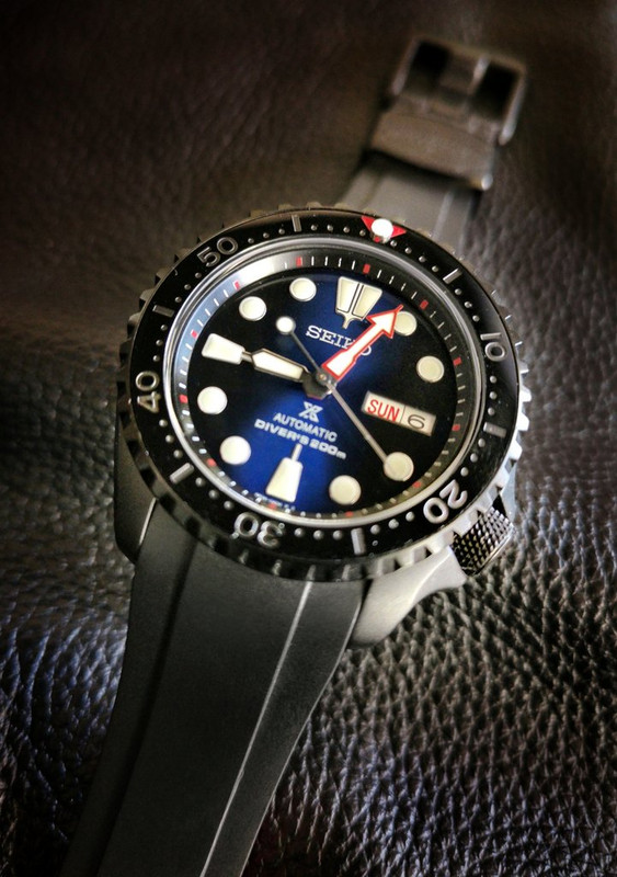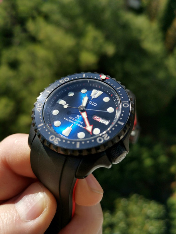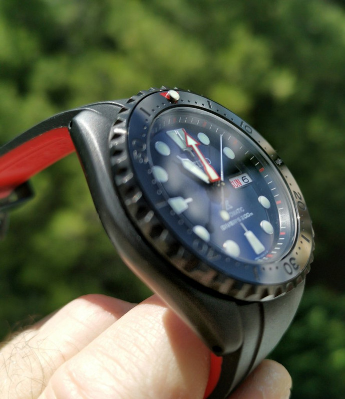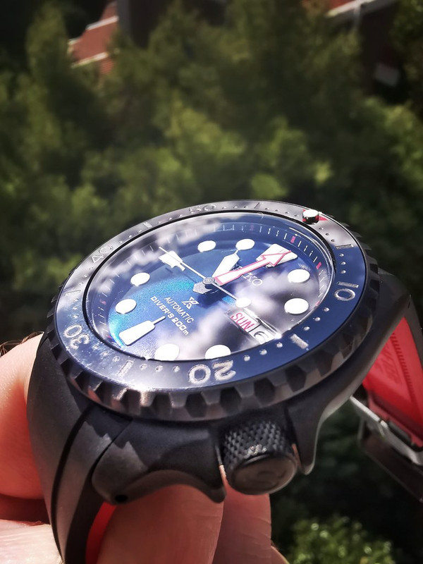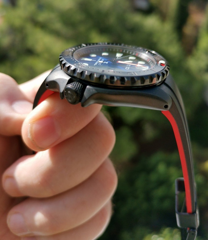 Δοκιμάσαμε και πολλά ένθετα στεφάνης (bezel inserts) όπου κατέληξα σ' αυτό (κεραμικό μαύρο τύπου stealth με κόκκινο τρίγωνο και lume peep στο 12). Επίσης αλλάξαμε την κορώνα, με την αγαπημένη μου τύπου knurled "ρικνωμένη")