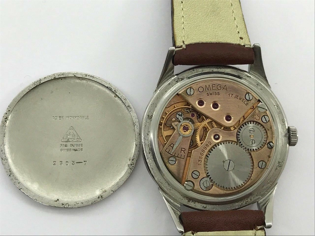 εσωτερικό του caseback (2603-7) το οποίο είναι ο κωδικός του μοντέλου, ένα τριψήφιο νούμερο με το σήμα της OMEGA (Ω 266) που είναι ο κωδικός του μηχανισμού και ένα