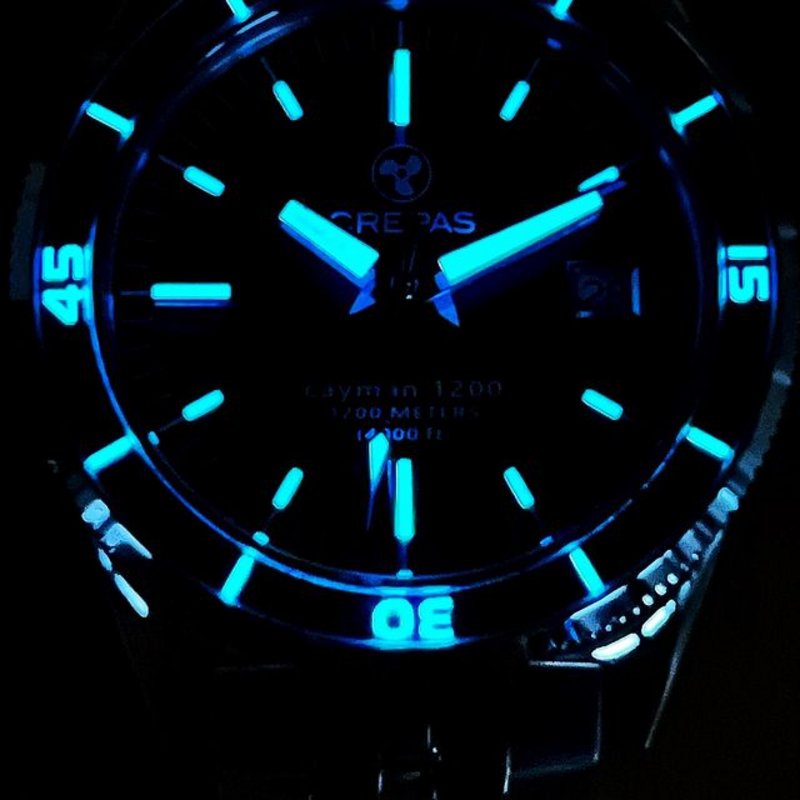 - 120 atm waterproof/1200 meters. Crown and case back cover screwed.