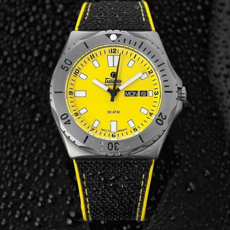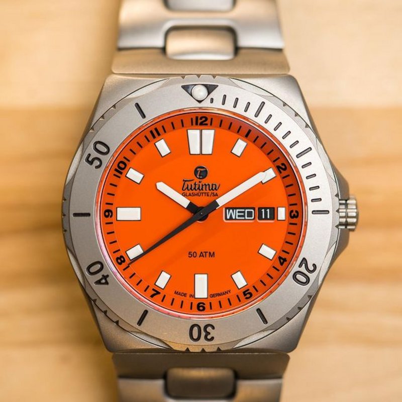 Glashütte watches. Restrained. Understated. Quiet. Very serious German watchmaking indeed. And then there are Tutima’s new diving watches. Yes, still that serious watchmaking but now with a distinctly brighter approach. Tutima has just released its two new M2 Seven Seas models, both with dials that would give your pet chameleon an identity crisis. There are two colours – nuclear sunset orange and vapourised canary yellow – and at 44mm diameter, neither is going to be a shrinking violet nor a challenge to read.