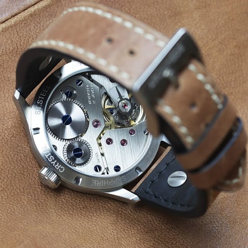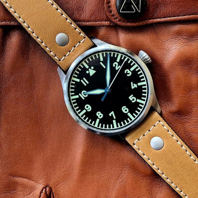 The Pilot 42 Titanium watch has a black dial featuring luminous heated-blued hands made by ICKLER. Water-resistant to 100 meters, it comes with a sapphire crystal case-back.
