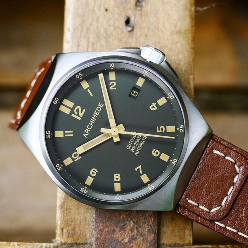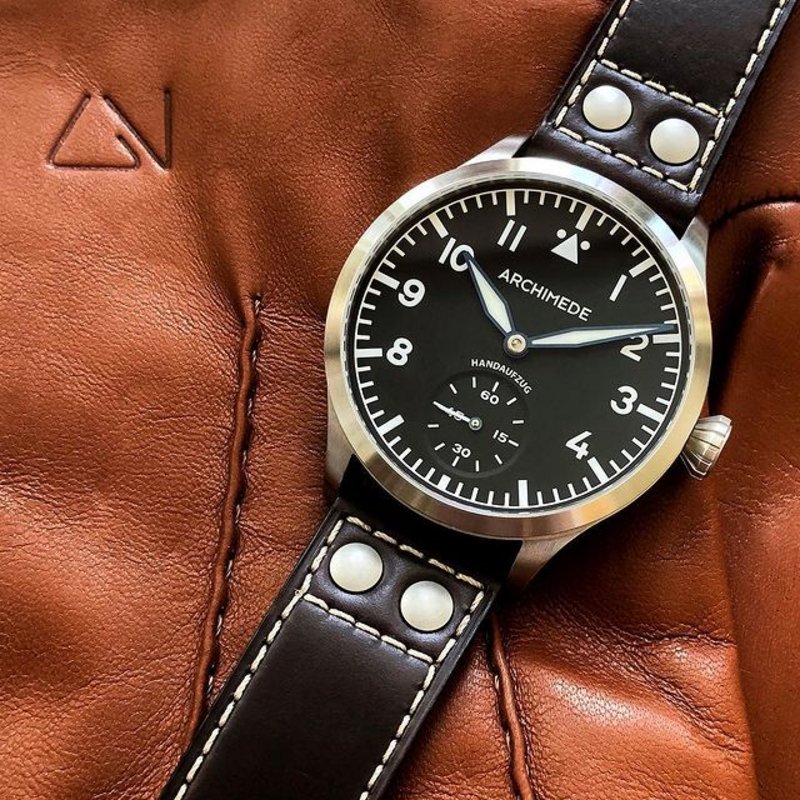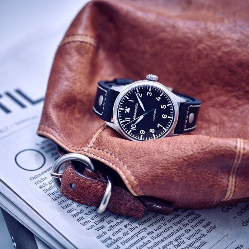 The titanium version of the ARCHIMEDE Pilot 42 automatic watch was introduced in 2020 with a riveted leather strap. Its case is made of grade 2, DIN 3.703 titanium. Manufactured by ICKLER, it offers high wearing comfort, lightness, corrosion resistance and robustness.