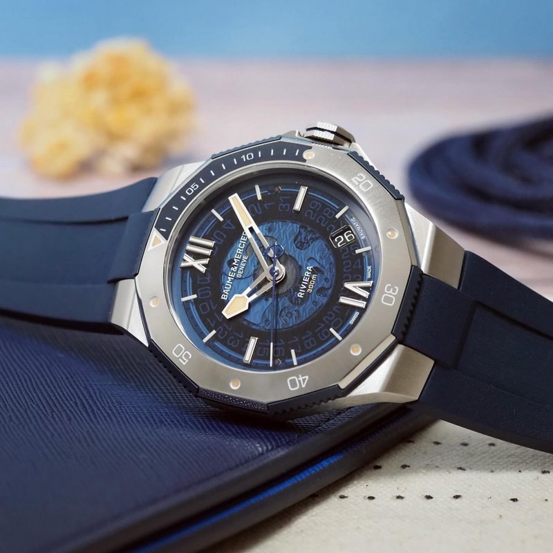 The Baume & Mercier Riviera Azur 300m is available on a a steel or rubber strap that can be quickly exchanged without tools thanks to the brand’s “Fast Strap” interchangeability system. The price had not yet been specified at the time of publication.