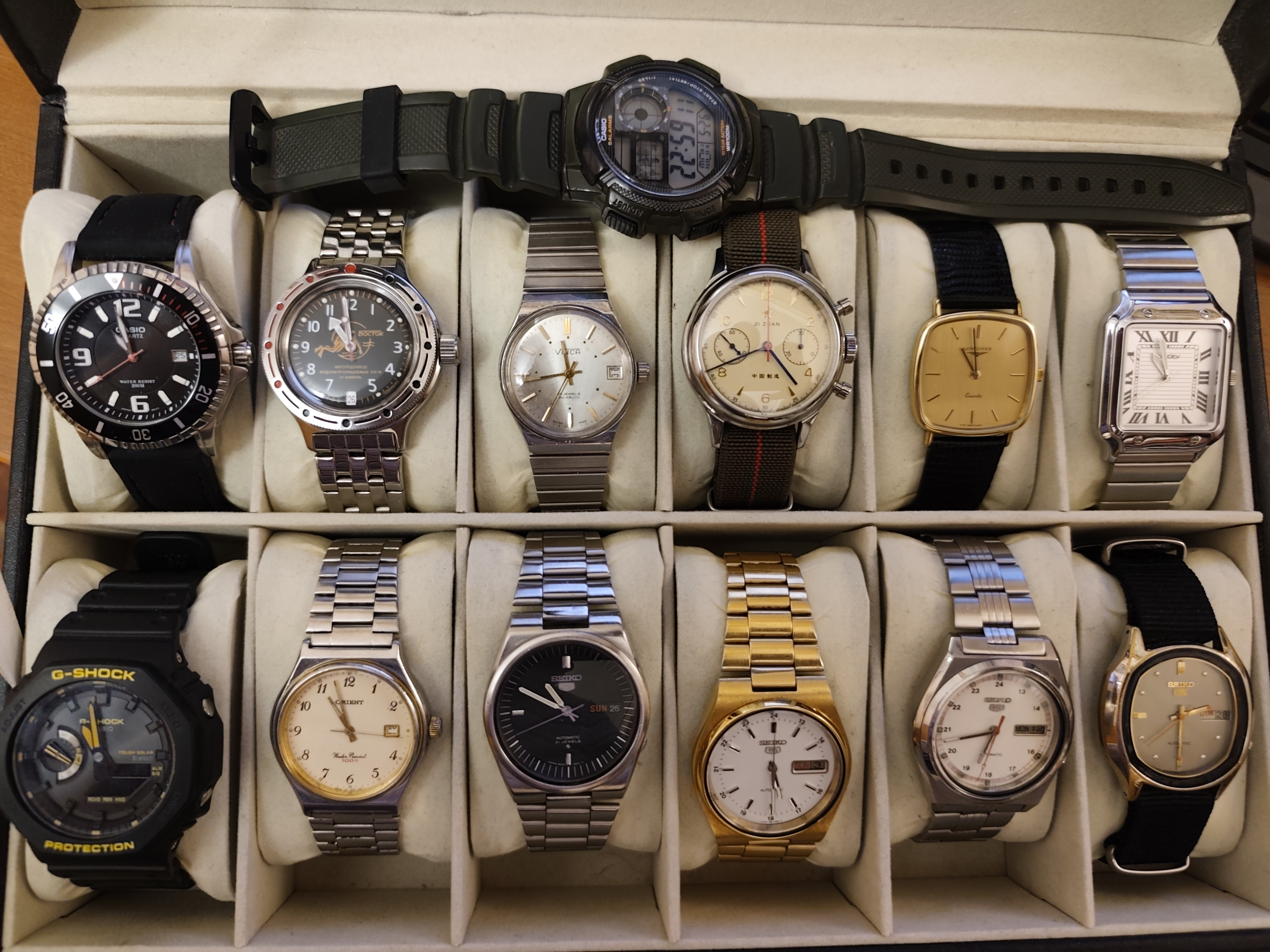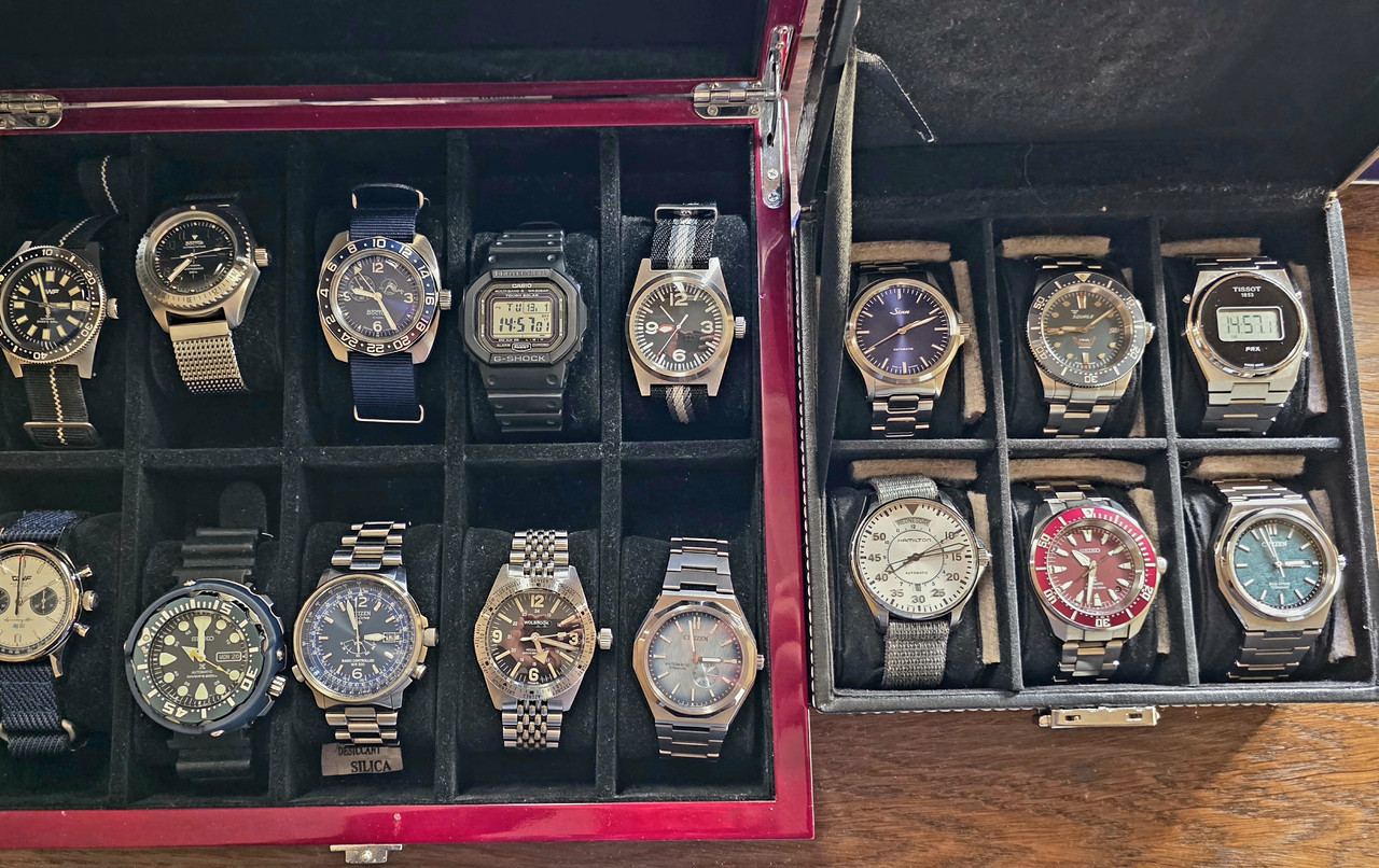 Σήμερα είπα να σας δείξω κι εγώ την ταπεινή μου συλλογή. Λείπει μόνο ένα ρολόι, Seiko 7A38, το οποίο περιμένω αύριο από το σέρβις, αλλά έτσι κι αλλιώς δε θα χώραγε στη φωτογραφία.