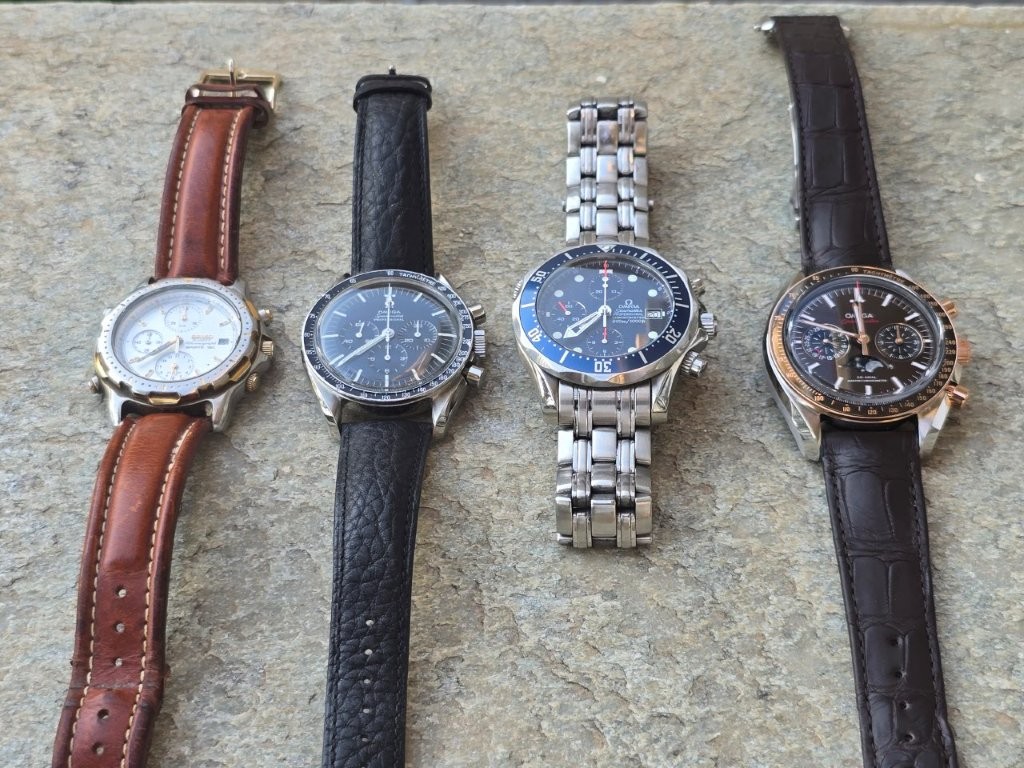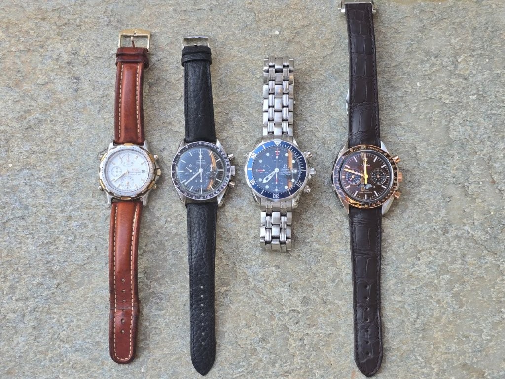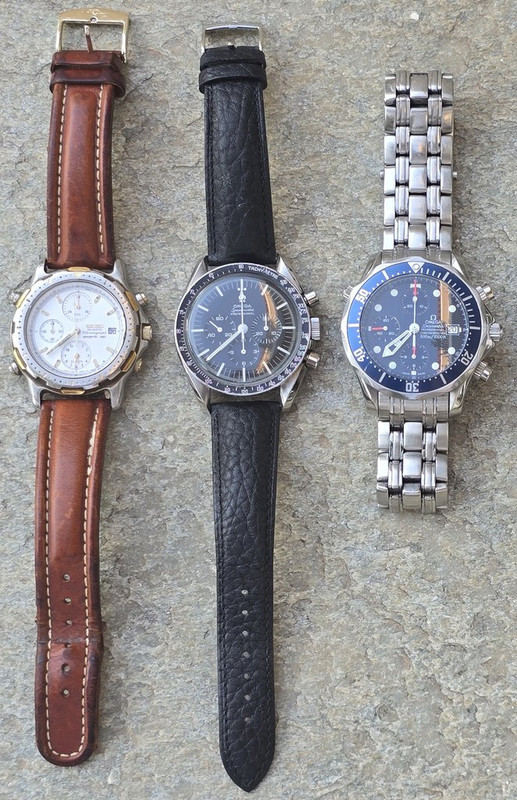 Ο πεθερός μας, από την άλλη, φόρεσε όλη του την ενήλικη ζωή ένα μόνον ρολόι - το Speedmaster Professional (Ref. 145-012) αγορασμένο το 1968, πάνω στη μόδα (φυσικά) των διαστημικών αποστολών της NASA. Καταλαβαίνουμε ότι πρόκειται για συλλεκτικό holy grail, με τον 321, hazelite, DON (dot-over-ninety) bezel, απλικέ μεταλλικό σήμα Ωμέγα στο καντράν (όχι βαμμένο, όπως στις μεταγενέστερες γενιές) και το δευτερολεπτοδείκτη με την φαρδιά ουρά...  Βέβαια, στο άκουσμα των ιστοριών του ("πετάγαμε τότε το ρολόι από τον 1ο όροφο για να δούμε εάν θα σταματήσει") πάγωνε λίγο το αίμα μας, αλλά αυτό ήταν και το marketing της τότε εποχής μάλλον ("δε χαλάει"!).  :P