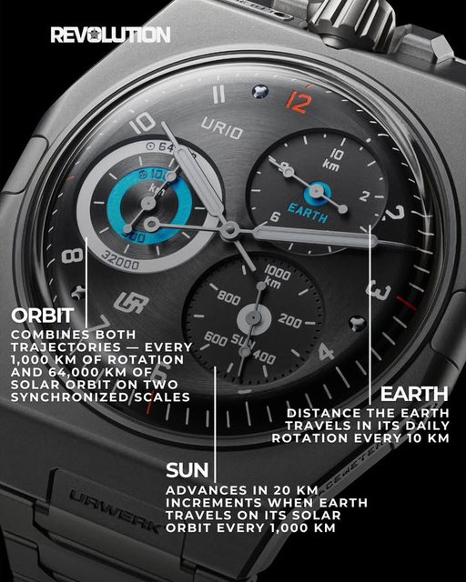 Under the sapphire crystal dome, the compass-like dial employs Urwerk’s signature satellite configuration of wandering hour and minute markers to show how far you’ve moved through space. Once the watch’s minute hand has completed its 60-minute journey, it suddenly reappears on a 20-minute scale of 555 kilometers. This is the distance you’d travel in 20 minutes if you were standing on Earth’s equator. Another scale on its face “tracks your journey around the sun: 35,740 kilometres every 20 minutes,” according to Urwerk.