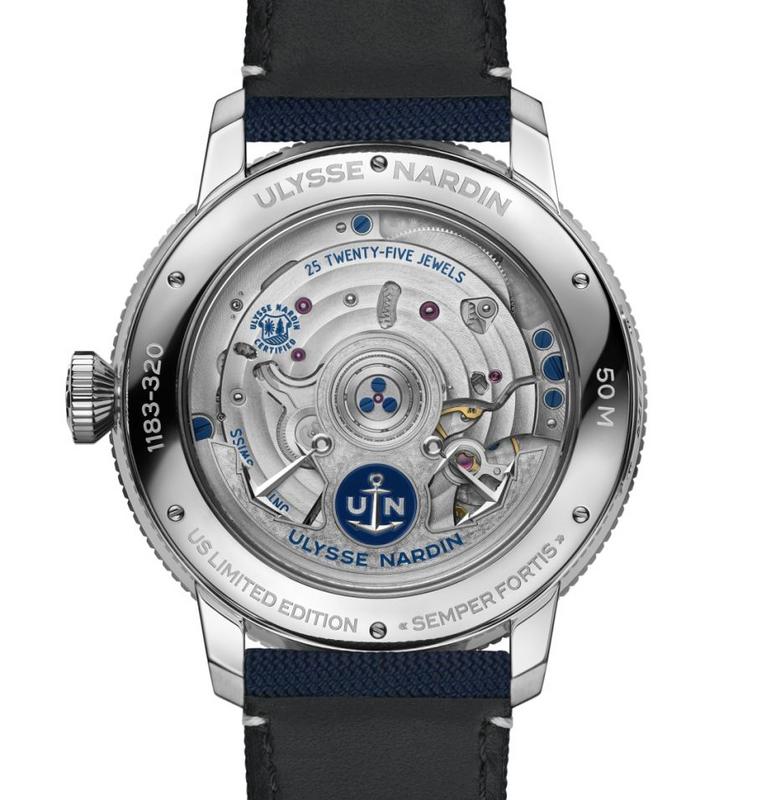 The case, in polished and satin stainless steel, measures 44mm. Fluted steel bezel. It has an AR-coated sapphire crystal, a sapphire display back, and it is water resistant to 50 meters. The caseback is laser engraved with "U.S. Limited Edition" and the "Semper Fortis" motto.