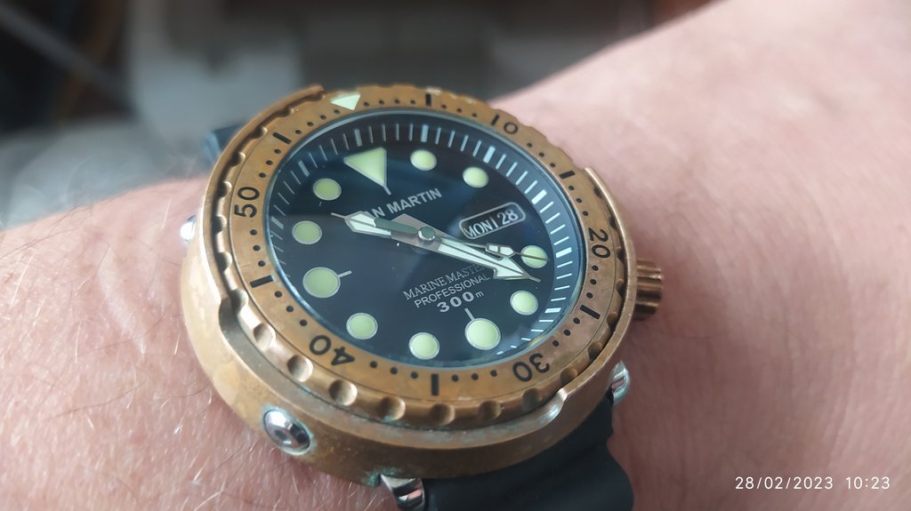 Ίσως ο τρόπος που το έγραψα να έδωσε λάθος εντύπωση. Ίσα ίσα που το εκτιμώ πάρα πολύ. Το θέμα με τη μη ευθυγράμμιση της μέρας λύθηκε μετά από μερικές φορές. Το μόνο μείον είναι ότι το πιάσιμο της στεφάνης δεν είναι πολύ σταθερό αλλά δε με ενοχλεί. Τώρα που έφυγε η γυαλάδα που είχε αρχικά μου αρέσει περισσότερο αλλά από τη μια θέλω να το αφήσω να κάνει μόνο του την πατίνα αλλά από την άλλη με γαργαλάει να την επιταχύνω λίγο. Η κατασκευή του είναι προσεγμένη και το θέμα που ανάφερα για το "λίγο κοφτερό" τμήμα ανάμεσα στα lugs το είπα γιατί θεωρώ ότι δε συνάδει με το υπόλοιπο φινίρισμα. Το φοράω και το χαίρομαι και περιμένω να έρθει το καλοκαίρι ώστε ο ιδρώτας και η αλμύρα να επέμβουν πάνω του και να του δώσουν την πολυπόθητη για μένα εικόνα της πατίνας
