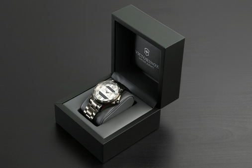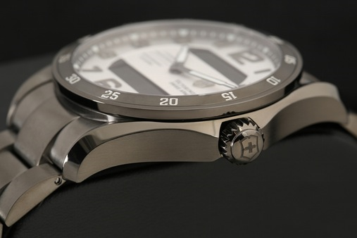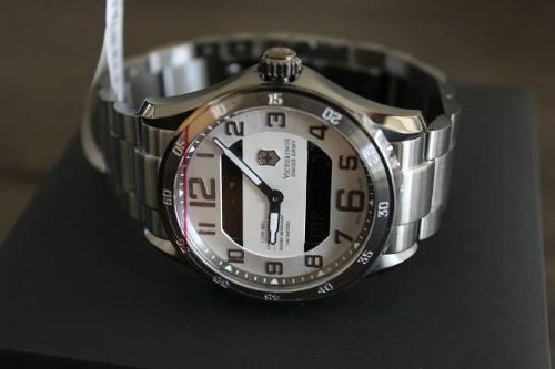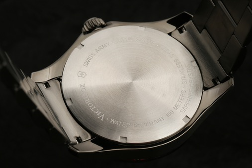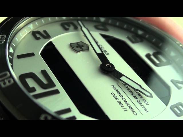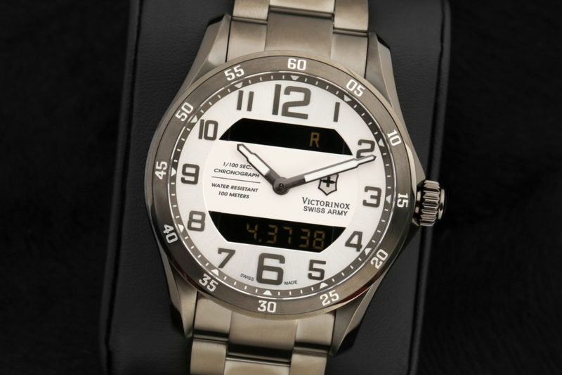 Η κάσα του είναι 45mm και το πάχος της μόλις 11,8 πράγμα που το καθιστά πραγματικά ευκολοφόρετο. Τα lugs έχουν απόσταση μεταξύ τους 23mm (αν και η Victorinox αναφέρει 22mm). Οι ψηφιακές οθόνες θα μας δώσουν δεύτερη ζώνη ώρας, ξυπνητήρι, διαρκές ημερολόγιο, χρονόμετρο αντίστροφης και κανονικής μέτρησης. Τη νύχτα θα φωσφορίσουν αρκετά καλά ο ωροδείκτης και ο λεπτοδείκτης και τα λιγότερα ευδιάκριτα μικρά σημεία στο εσωτερικό τοίχωμα που βρίσκεται κάτω από τη μη περιστρεφόμενη στεφάνη 60 λεπτών του ρολογιού (με διαστήματα των 5 λεπτών). Τη πλάτη του ρολογιού θα την χαρακτήριζα μάλλον αδιάφορη. Δεν είναι κατάλληλο για καταδύσεις αλλά αντέχει σε πιέσεις μέχρι 100m και άρα αν κατά λάθος βουτήξετε για ένα μπανάκι μαζί του, δε θα προβληματιστείτε.