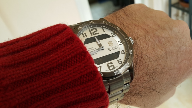 Κι ενώ ξεκίνησα με τη βεβαιότητα πως θα καταλήξω στο καταδυτικό ρολόι της Victorinox βρέθηκα να παραγγέλνω το πανέμορφο Ana-Digi της. Ατυχώς στις περισσότερες φωτογραφίες που κυκλοφορούν στο διαδίκτυο, το συγκεκριμένο dial φαίνεται σαν να είναι λευκό και το γεγονός αυτό κυριολεκτικά εξαφανίζει την αρχοντιά που αποδίδει το ασημένιο με την οριακή champagne color διχρωμία του, που θα αντικρίσεις όπως είναι μόνο όταν δεις το ρολόι από κοντά.