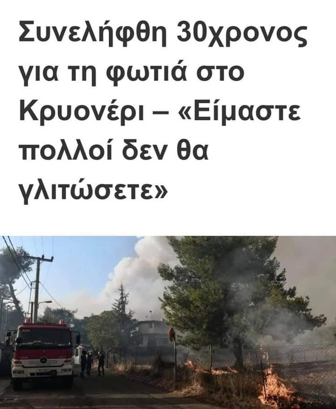Το πιο γελοίο απ' όλα είναι οι ειδήσεις για εμπρηστες στο Κρυονέρι ενώ μια δυο μέρες πριν μας μιλούσαν σε γλαφυρά ρεπορτάζ για την φοβερή παρουσία και προσπάθεια της αστυνομίας να εκκενώσει το μέρος πορτα-πορτα, παράλληλα -οι αχρηστοι-, καιγανε τον τόπο μπροστά στα μάτια τους.