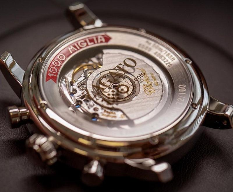 The case, in stainless steel, measures 42mm x 12.6mm. It has an AR-coated sapphire crystal, a sapphire display back (cngraved with the Zagato 100th Anniversary logo), and it is water resistant to 50 meters.