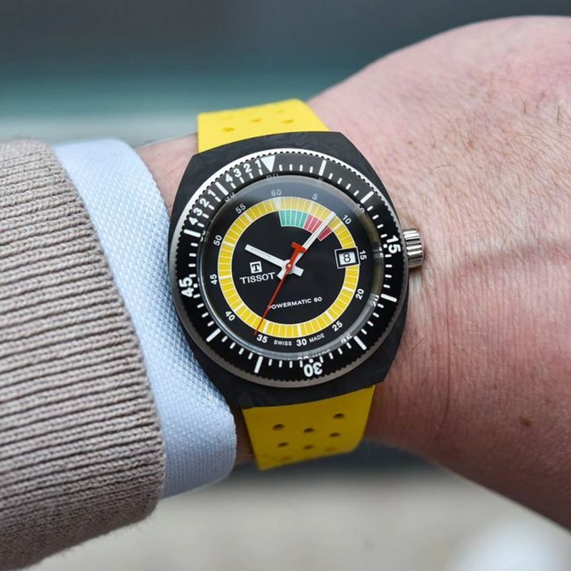 The Tissot Sideral is more than just a watch; it’s an emblematic timepiece with a rich history dating back to 1971. As a member of the Sideral family launched in 1969, the original Sideral was the world’s first fiberglass watch, featuring a lightweight yet robust design. This ground-breaking watch gained acclaim from sports enthusiasts and trendsetters alike. In 1971, the Sideral S debuted, featuring the iconic yellow rubber strap and its innovative fastening system – signature elements of the Sideral family. Initially introduced on a Sideral watch in 1969, the strap’s popularity soon led to its incorporation into the Sideral S model.