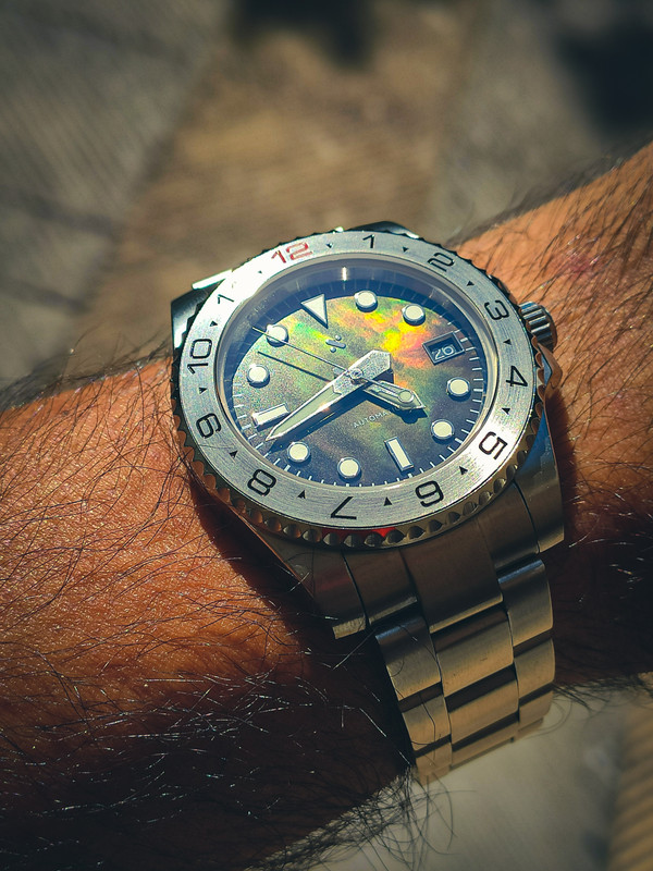 Το 2ο. Συνήθως δείχνει μαύρο ή γενικά σκούρο με κάποια υποψία ότι κάτι παίζει γιατί όλο και κάποιο χρώμα πάει να πεταχτεί. Ανάλογα το φως και τη γωνία μπορεί να γίνει πιο εντυπωσιακό. Απο κοντά όπως βλέπεις τα χρώματα να αλλάζουν δίνει ένα τρομερό βάθος στο καντράν, στις φωτογραφίες δεν γίνεται αντιληπτό. Υπάρχουν και πιο ζωηρά mop καντράν αλλά μου αρέσει το συγκεκριμένο που είναι διακριτικό.
