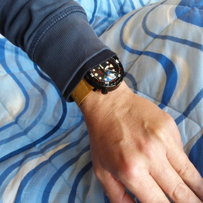 Πρώτη φορά που φορώ τόνο/τύπου τόνο. Ιδιαίτερα χαρακτηριστικό το σχετικά κοντό lug-to-lug. To 22-άρι lug width όπως και η όλη σχεδίαση της κάσας βολεύουν πολύ με διάφορα λουριά.