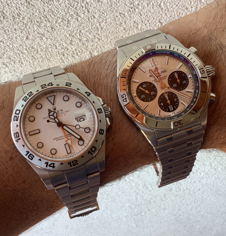 Κοιτα,είμαι από αυτούς που για κάποιο λόγο δεν παθαίνω κάτι ιδιαίτερο με το όνομα Rolex,να το πουλήσω δεν σκοπεύω για να πάρω τα ενοίκια μου,όποτε απαλλαγμένος από όλα αυτά και με τελείως άλλη οπτική <<συγκρίνω>> δυο ρολόγια εφάμιλλης ποιότητας,αν όχι πιο στιβαρό το chronomat, που μου αρέσουν εξισου πάρα πολύ και που αν έπρεπε να διαλέξω ένα,εγκεφαλικά κλείνω περισσότερο προς το chronomat λόγο της σχέσης μου με την εταιρία και το συγκεκριμένο μοντέλο. Από εκεί και πέρα και το explorer ii είναι μεγάλος έρωτας!