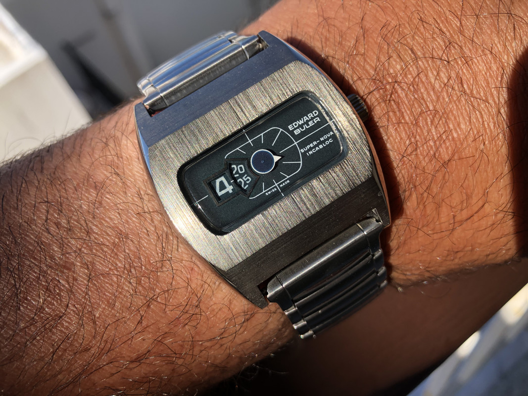 Συγνώμη που άργησα να απαντήσω. Αυτούνο αυτού είναι ένα ρολογάκι από την δεκαετία του 70 το οποίο αγόρασα σε εξαιρετική κατάσταση. Δεν λέει τίποτα σαν μηχανισμός, ένα απλό κουρδιστό ρολόι jumping hour είναι. Πολλές μάρκες είχαν βγάλει παρόμοια ρολόγια, με παρόμοιο σχεδιασμό (Space Era) τα οποία ήταν και πολύ οικονομικά για τα δεδομένα των Swiss Made. Το συγκεκριμένο όμως μου έκανε κλικ με τον σχεδιασμό του και τις βουρτσισμένες επιφάνειες...ήταν και αφόρετο (NOS).