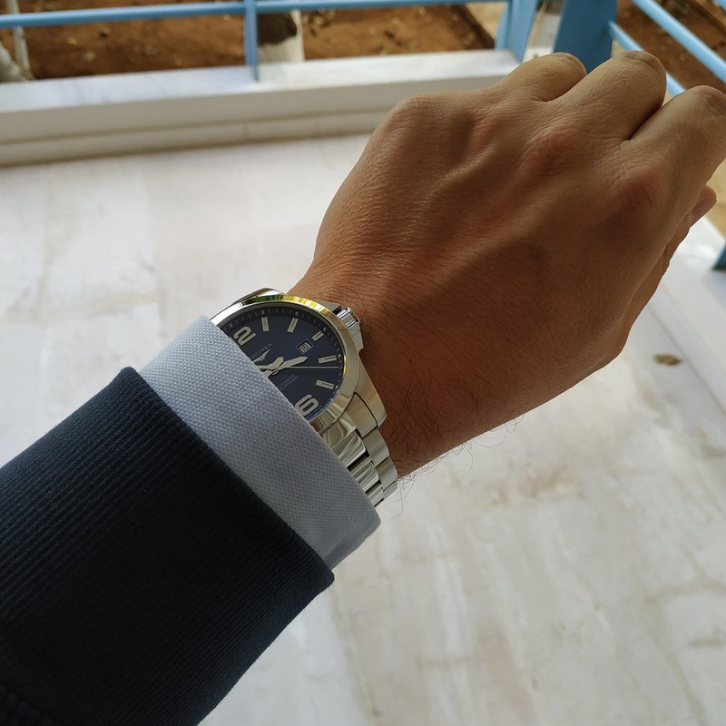 Conquest 43-αρι, μπλε dial.Μεγάλη κάσα, η συνολική κομψότητα & σχεδίαση κάπως τραβηγμένη αλλά γενικά πολύ ποιοτικό για τα χρήματά του.Βιδωτή κορώνα, 300 μέτρα υδατοστεγανότητα...Χρονομετρία περίπου +4.8"/ημέρα (love it). Λεπτή σχετικά κάσα, κάπου στα 11.5 χιλιοστά πάχος ίσως, δεν έχω μετρήσει.Με έντονο dressy χαρακτήρα, τη στιγμή που το Hydroconquest έχει καταδυτικό deployant buckle κλπ.Το μπλε dial δύσκολο γενικά στους χρωματικούς συνδυασμούς, αλλά ως dial γενικά πάρα πολύ ωραία φινιρισμένο για ρολόι τέτοιας τιμής.Το μπρασελέ στιβαρό και πολύ όμορφα γυαλισμένο, σε κάνει να έρχεσαι (επιτέλους) στα ίσια σου όταν τολμήσεις να το συγκρίνεις με μπρασελέ Ιαπωνικής μάρκας εφάμιλλου price point.Ένα ρολόι που σου δίνει πολλά για αυτά που πληρώνεις - και μπράβο τους.Δεν θα μείνω μόνο σε αυτό, από τη συγκεκριμένη μάρκα (κάαααπου στην Ασία υπάρχει Outlet Longines που έχει στοκ ατελείωτο, σε σπέσιαλ τιμές μιας και ντόπιοι εκεί δεν τα προτιμούν....)