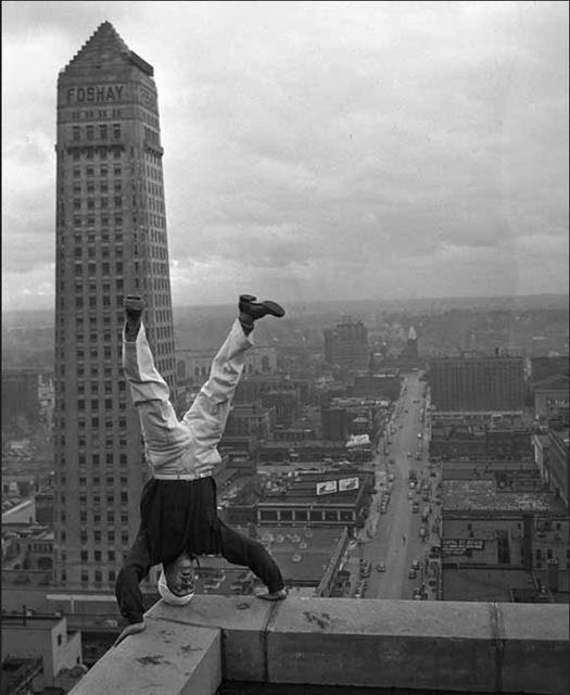 September 27 1942: An acrobat on the roof edge of a skyscraper in Minneapolis