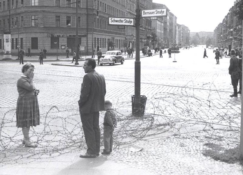 East German woman stands crying after she passed a young boy to a man in West Berlin, over a barbed wire fence,1961
