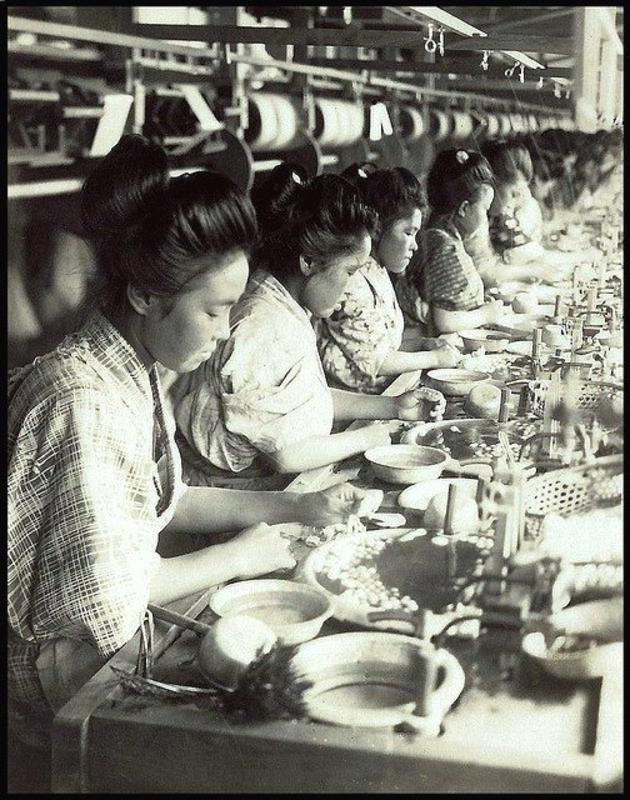 Silk factory girls drawing threas from cocoons in old Japan. By by Okinawa Soba