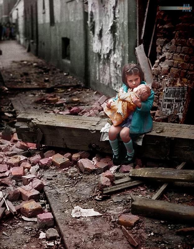 A young girl sits with a doll outside the rubble of her bombed home. London, 1940