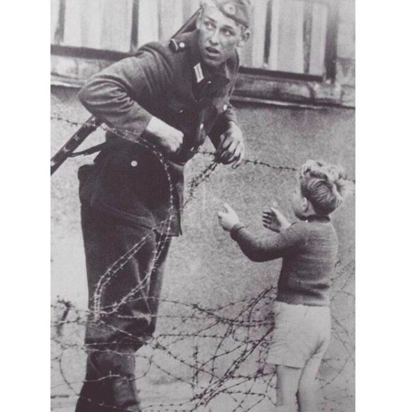 East German soldier helping a boy cross the new Berlin Wall, to reunite with his family. 1961