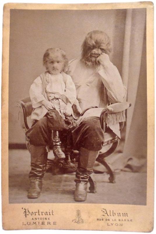 Famous Russian sideshow performer Jo-Jo the Dog-Faced Boy sitting with his father, circa 1875