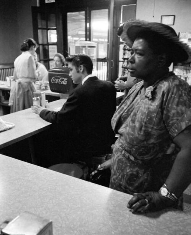 Elvis Presley waiting for his bacon and eggs while a woman waits for her sandwich. she is not permitted to sit, 1956