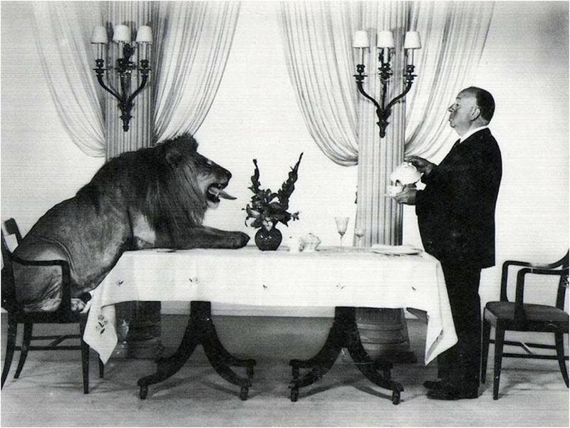 Alfred Hitchcock serving tea to Leo the Lion, MGM's mascot, 1958