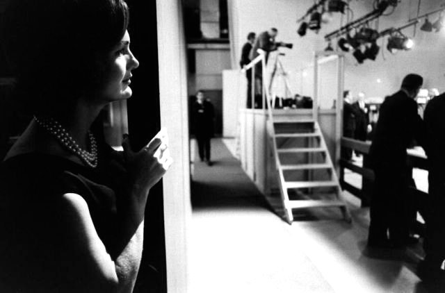 Jacqueline Kennedy backstage watching her husband during the first televised debate against Richard Nixon  1960