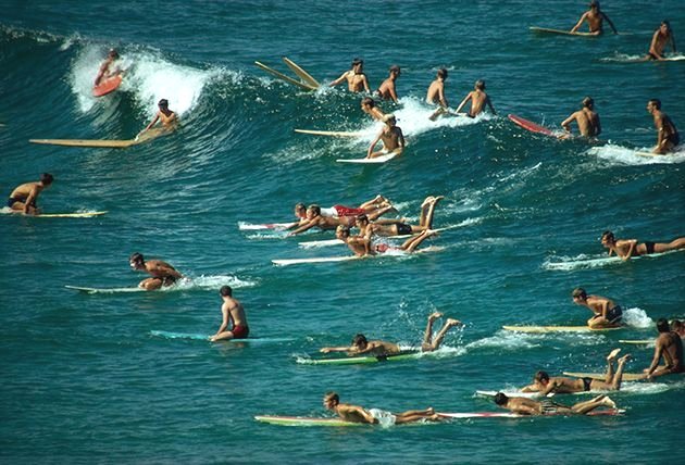 Surfers overpopulate the waves off of Bondi Beach in Australia, 1963