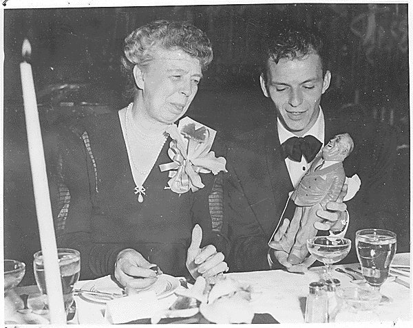 Frank Sinatra presents Eleanor Roosevelt with a figurine of her husband President FDR