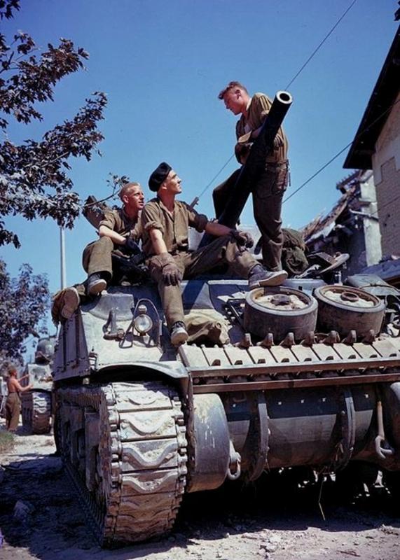 Canadian crew of a Sherman-tank south of Vaucelles near Caen (Calvados Basse-Normandie France) during the battle of Normandy in June 1944