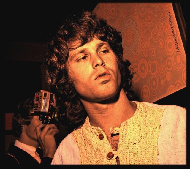 Jim Morrison of the Doors in the 1960s and a flashy Nikon camera in the back