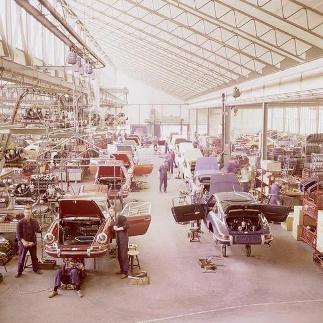 The assembly line of Porsche 911's at the Stuttgart factory, 1970