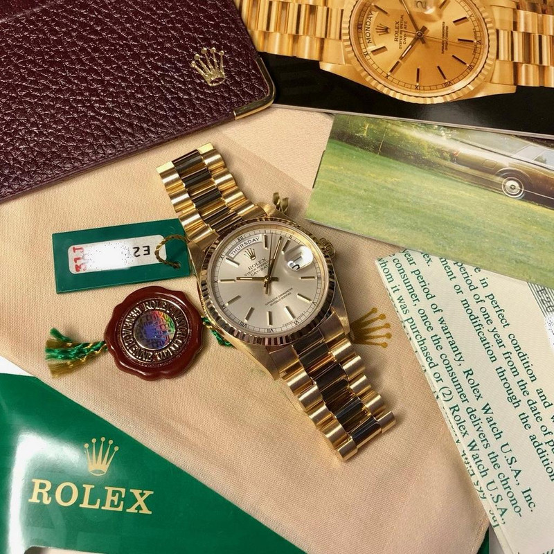https://www.hashtagwatchco.com/products/rolex-president-18238-day-date-18k-yellow-gold-silver-stick-e-serial-1990-box-papers-mint