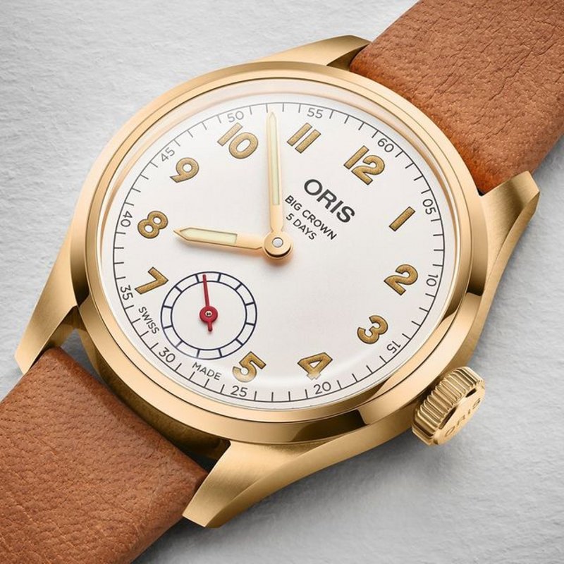 This is the new Oris Big Crown small seconds with the CaliBear 401 movement. As you can see it comes in two case materials, the steel measures Ø40mm and will be available in October and is limited to 1000pcs. The solid 18c yellow gold case is ready as we speak and measures Ø38mm