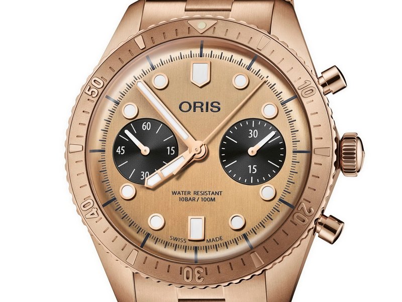 The new Oris Holstein Edition 2020 — the first in a series of timepieces that honor the village in which the brand was founded in 1904 — is a limited-edition version of the Divers Sixty-Five chronograph and evidently the first watch to feature a Swiss-made, all-bronze bracelet. Cased in solid bronze with a stainless steel case back embossed with the Oris Bear, it’s otherwise very much a classic Sixty-Five chrono, with a 43mm diameter, a unidirectional rotating bezel with bronze insert, a domed sapphire crystal, and 100m of water resistance.