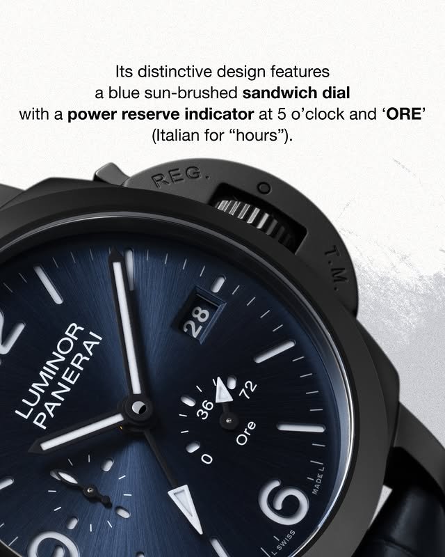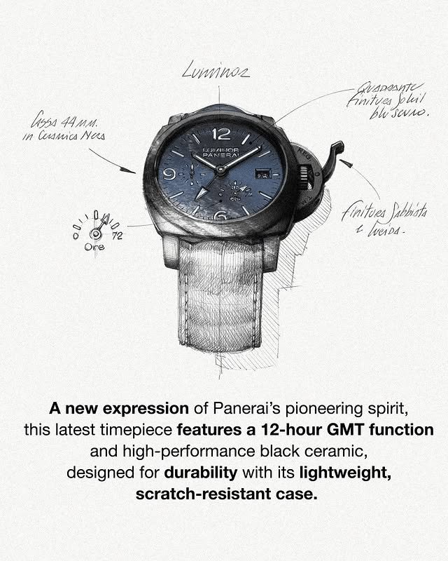 Luminor GMT Power Reserve Ceramica PAM01574 features a 44mm black ceramic case with sandblasted and polished finishes, housing the P.9012 calibre with GMT