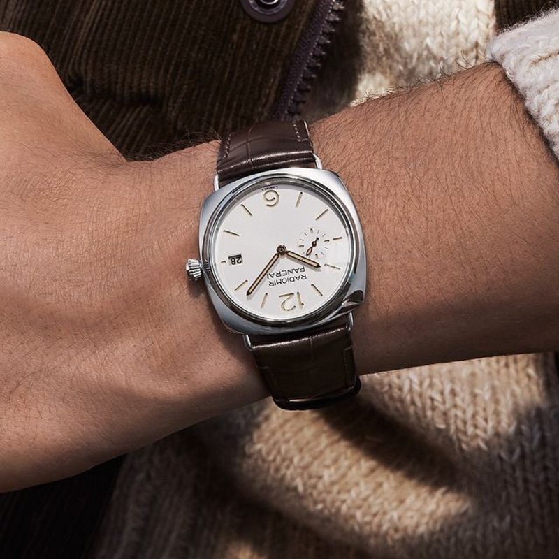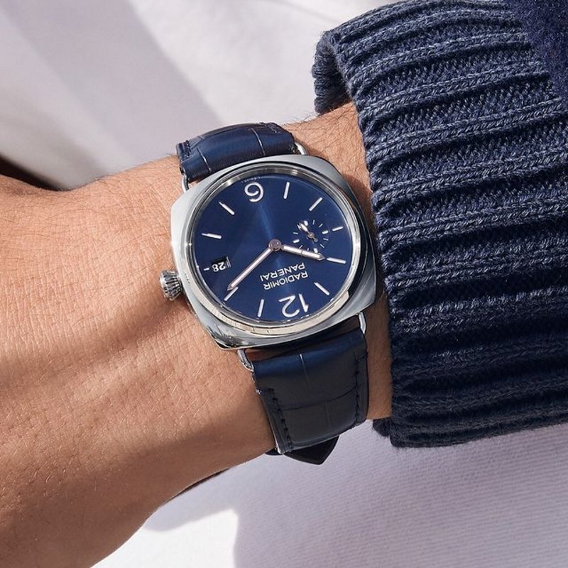 Accompanying the 38mm polished steel case with a closed back is a metal bracelet inspired by Panerai’s distinctive crown-protection device, where each link of the bracelet bears the iconic semi-oval profile of the safety-lock system. Alternating between polished and brushed finishes, the curved links lend a refined finesse to the timepieces that are perfect additions to the dress watch wardrobe.