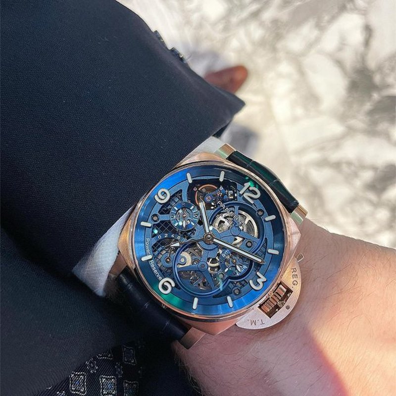 Blue is also used for the PAM01293, where the rich hue serves as a magnificent backdrop for the gold furnishings. Lovers of dark dials will appreciate the PM01294, which combines an anthracite dial with gold accents.