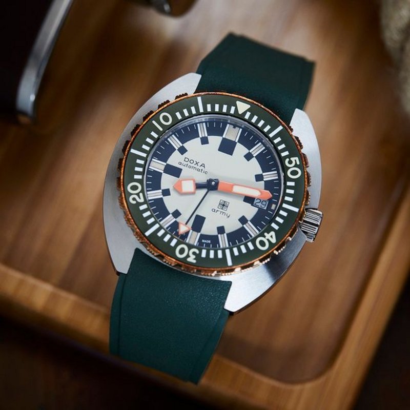 This new DOXA Army model features a unidirectional rotating bezel in bronze that oxidates and creates a unique patina