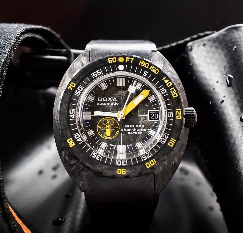 The striking look of the DOXA SUB 300 Carbon Aqua Lung US DIVERS. Its 1960s cushion-shaped case is crafted from a single block of forged carbon. The dial is made of carbon too