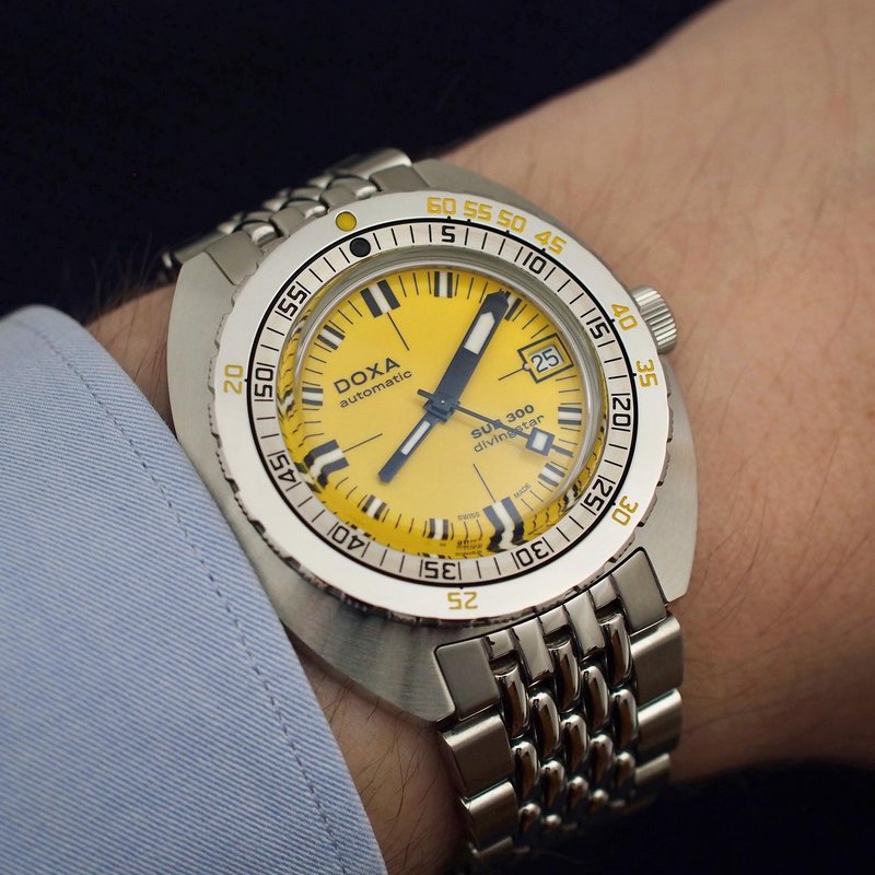 A legend among divers, the DOXA SUB 300 Professional. Here with a bright yellow dial. Also available in other 6 colours and rubber straps. The automatic movement is COSC-certified